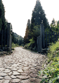 県道との分岐点から4〜5キロほど進んだところで、右手に細い石畳の道が大きな柵の向こうへと伸びている。