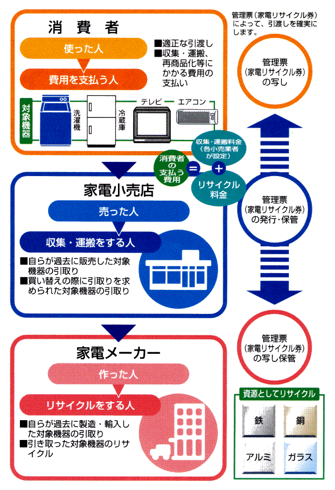 小売店には、過去に販売した同種の機器や買い替えの際に引取りを求められた同種の機器を引き取り、家電メーカーに引き渡す義務が課せられた。