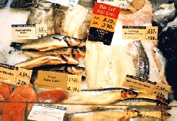 滞在中、食糧調達にイギリス最大手のスーパーTESCOへ何度か通った。魚や肉は量り売りをしていて、パックされているのは冷凍ものだけであった。県内のスーパーでは、このような光景はあまりお目にかかれない。トレイに入れられた魚に比べておいしそうに感じられた。また、野菜、果物も個別包装はなく、一個またはグラムあたりの値段が示されていた。