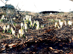 小屋から数分も進むと、有名なミズバショウ群生地に着く。