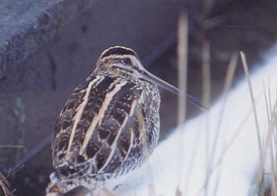 湿田で長い嘴を突き刺して餌を採る.次列風切の先が白く飛ぶと目立つ.