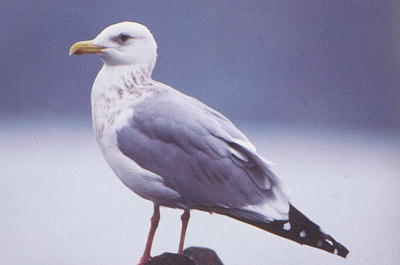 肉色の足で大型のカモメで,背の灰色と初列の黒色との対比の違いが目印だ.