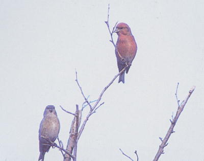 嘴が左右に食い違っていて松の実を好む.オスは赤褐色,メスは黄緑色で異なる.