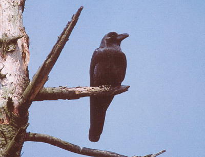 嘴が太く額が出っ張っていて「カァ,カァ」とか「アォ,アォ」と濁らないで鳴く.