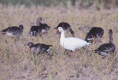 初列風切羽の黒い部分を除き,他は全体が白くマガンの群の中でも容易に区別できる.