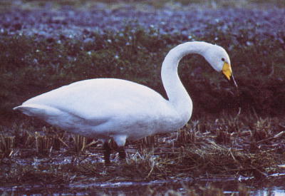 上嘴の基部から半分ほどが黄色いことがコハクチョウとの相違点となる.