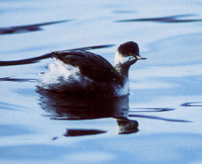 白い頬と赤い目が特徴で,湖沼で数羽見られるが,希に大群で見られることもある.
