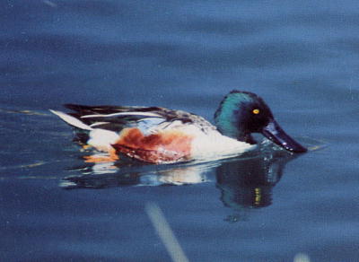 頭の緑色はマガモに似るが,脇腹の茶と胸の白が美しい.