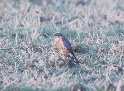 雄は背のグレーと腹の茶褐色が特徴で,細い眉線が有ることでチョウゲンボウと区別できる.