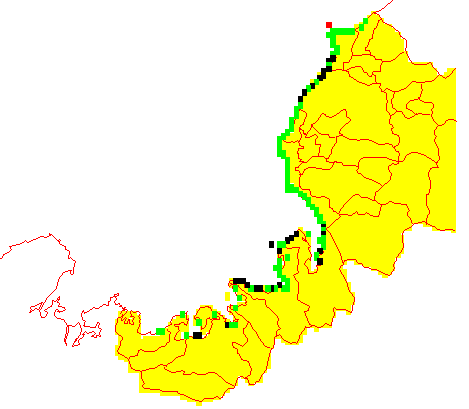 図の中で、黒色は油の漂着地域、緑は油が比較的少量。