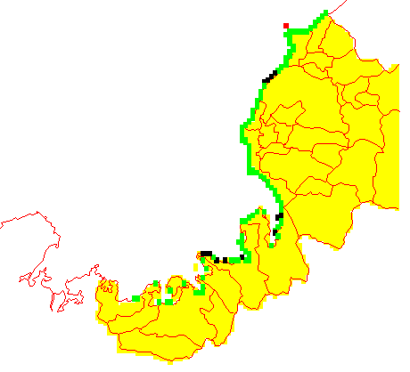 図の中で、黒色は油の漂着地域、緑は油が比較的少量。