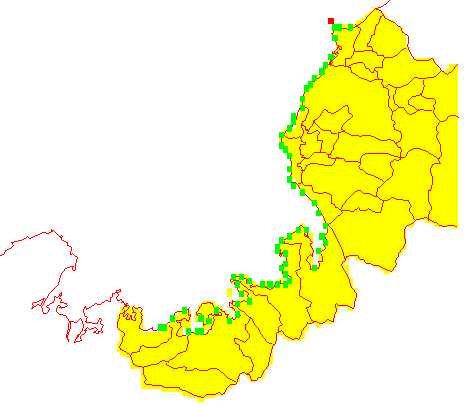 図の中で、黒色は油の漂着地域、緑は油が比較的少量。