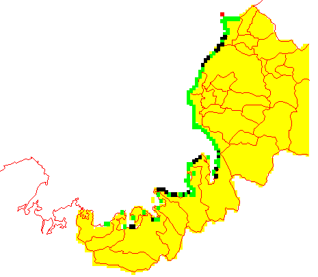 黒い色は油の漂着地域、