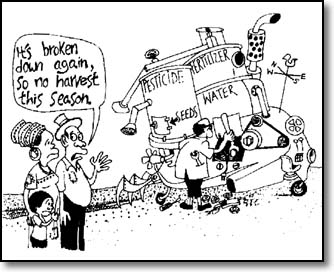 高集約型農法はどこでも恩恵をもたらすという誤解からそれは開発途上国にも 技術移転されましたが、多くの場合、益以上に害をもたらしました。 それらの技術は、しばしば全く不適切であったのみならず、維持費や保守体制の 不足によって数カ月もたたない内に生産性を失ったのです。このような状況では、 農業生産は経済的にも生態学的にも非持続可能です。