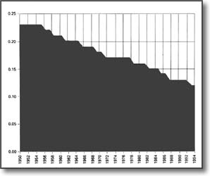 このグラフは世界平均での農業の生産性向上を示しています。 縦軸の単位はヘクタール、横軸は年です。 出典: Worldwatch Institute; U.S. Department of Agriculture, "World Grain Database" (unpublished printouts)(Washington, D.C., 1992). |